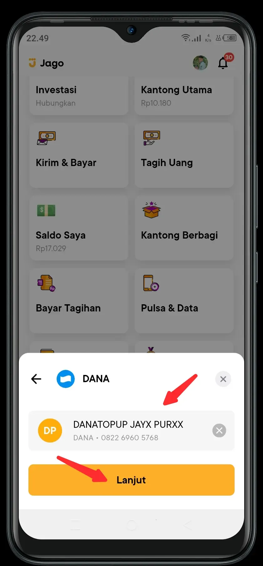 - Muncul Konfirmasi DANA top up, klik "Lanjut"